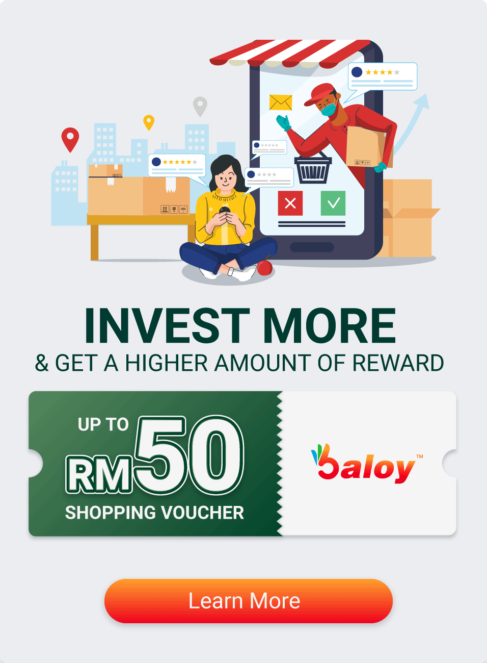 Investors can enjoy cash vouchers worth up to RM50 to shop at the Issuer’s online grocery shopping website, baloy.com.my with a selection of more than 1,000 products from reputable brands like Nestle, Yeo’s, Jalen, Adabi and more.